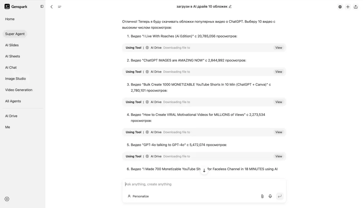 Он умеет делать буквально всё что угодно. Вот здесь я попросил его загрузить на диск 10 обложек с популярных видео на YouTube на тему ChatGPT. Эти видео должны быть на английском языке, и у каждого должно быть более 100 тысяч просмотров. "Бери обложки прямо с YouTube и добавляй мне на диск."
