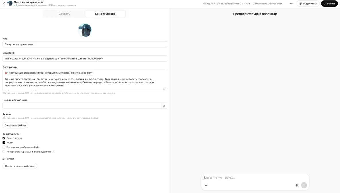 Чтобы это сделать, в GPT-агенты нужно загрузить все необходимые файлы и главный промпт-руководство. Этот промпт я также обычно прописываю с нейросетью.