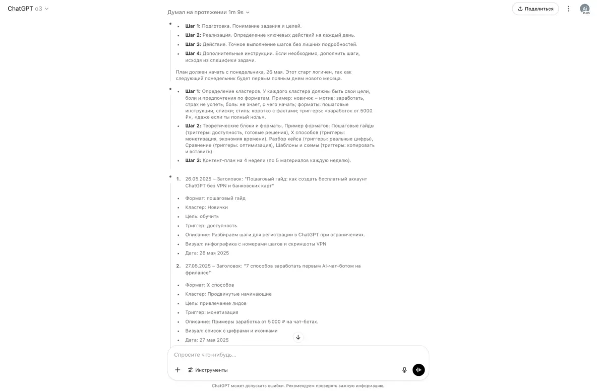 Именно размышляющая модель о3 легко поможет создать промпт, если просто отправить ему запрос с тем, чего вы хотите добиться.