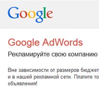 Мы предлагаем размещение контекстной рекламы и продвижение сайта в крупнейшей системе Google Adwords. Ваши объявления будут видеть тысячи посетителей Google ежедневно. Вам всего лишь нужно будет оплачивать переходы на ваш сайт и работу нашего специалиста по ведению вашей рекламной кампании.