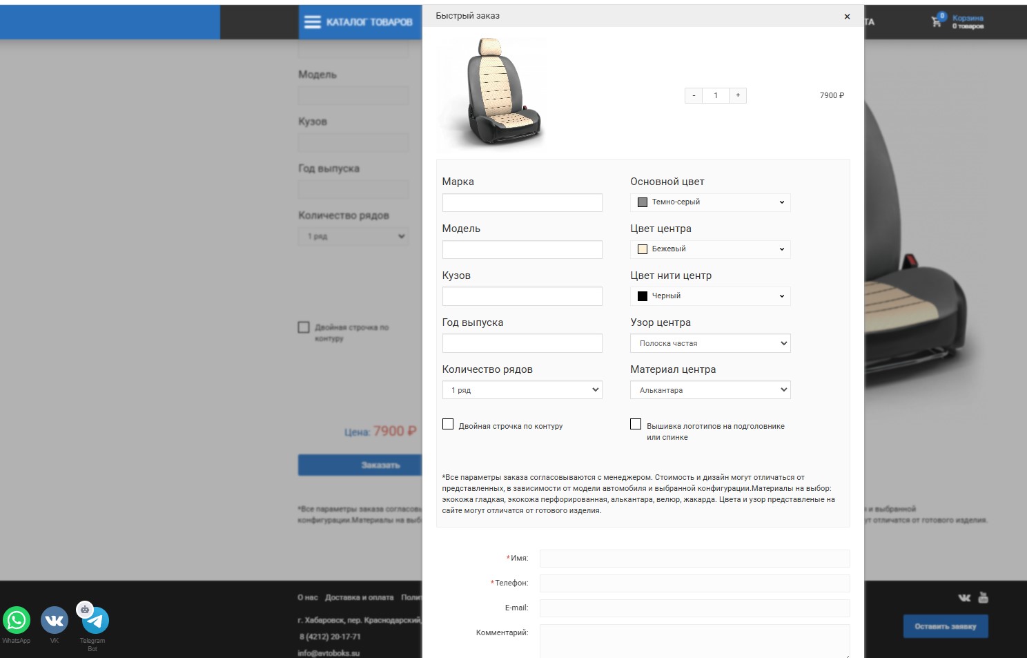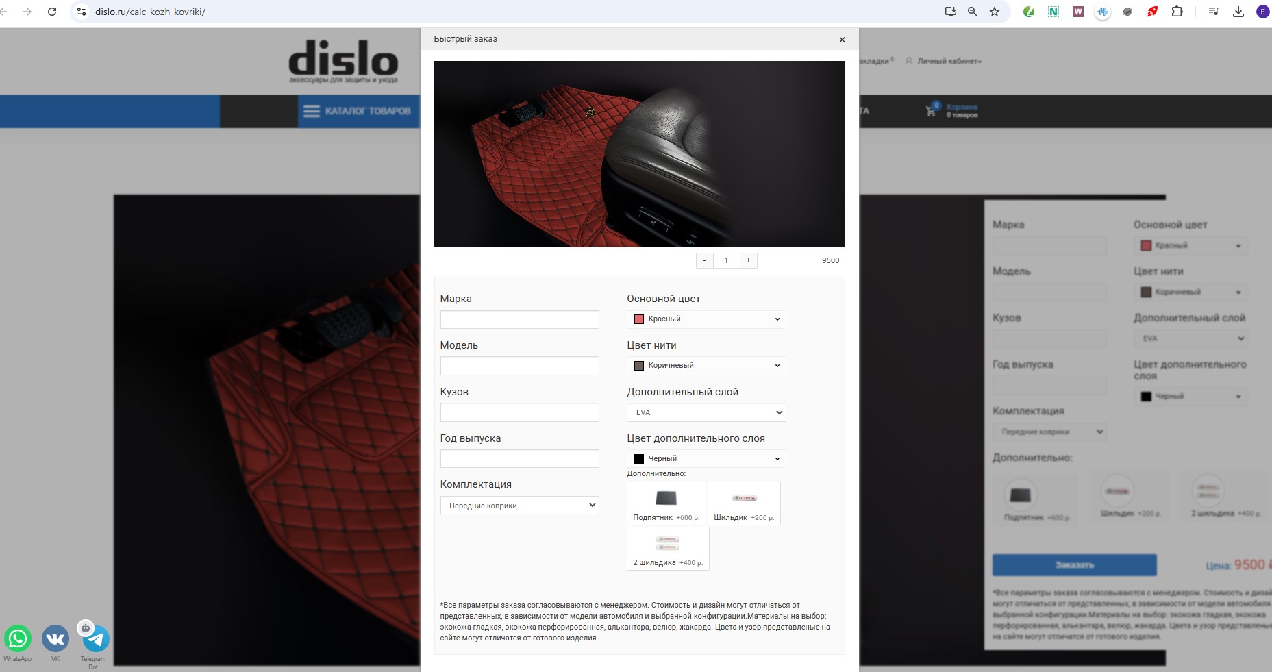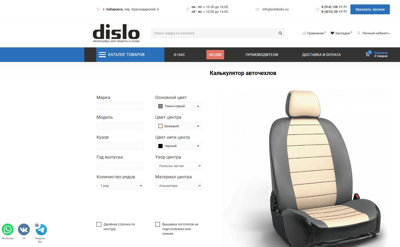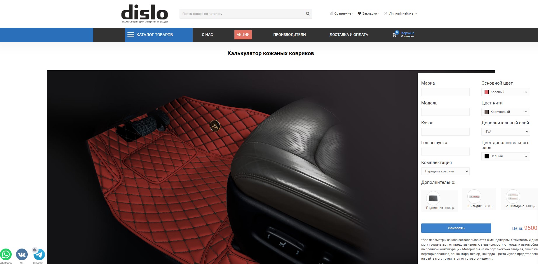 Калькулятор и система заказа авточехлов и автоковриков с визуальным отображением по параметрам, просчетом стоимостей, формированием и отправкой заявок менеджерам компании.