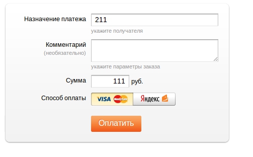 Обратите внимание: форма имеет фиксированные размеры. Если Вы хотите поставить модуль оплаты, например, в боковом блоке (где ограничено пространство), воспользуйтесь конструктором кнопки (см. ссылку выше). С помощью кнопки можно проводить платежи на фиксированную сумму (с помощью формы - на любую).