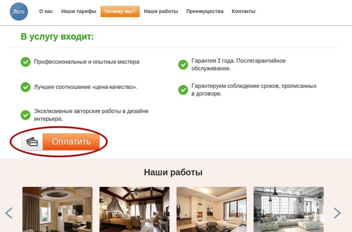 Так выглядит кнопка, позволяющая обратиться к модулю оплаты и провести платёж на фиксированную сумму (оптимальный вариант для сайтов вида «Посадочная страница», где предлагается один товар или услуга):