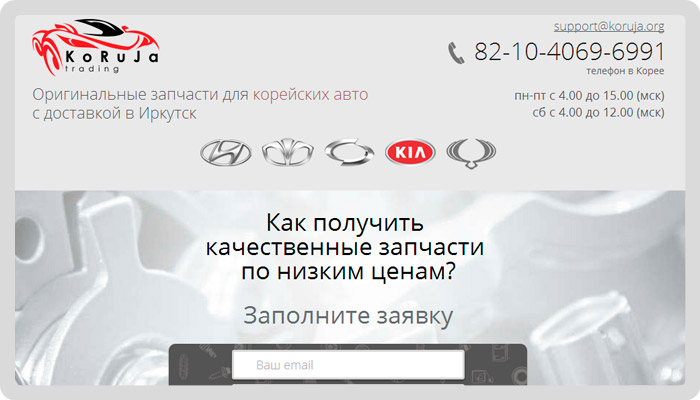 Уже в шапке есть фраза «Оригинальные запчасти для корейских авто с доставкой в Иркутск» из которой ясно, что на этом сайте есть то, что я искала (оригинальные запчасти), и что я действительно МОГУ это купить, т.к. они осуществляют «доставку в Иркутск».