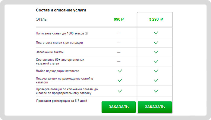 В феврале 2014 мы сформировали пакетное предложение, которое так и называется «Лень разбираться». В него включили все возможные работы, которые могут заинтересовать клиента, решившего продвигаться статьями. И дали ему простой выбор: только регистрация или пакет целиком.