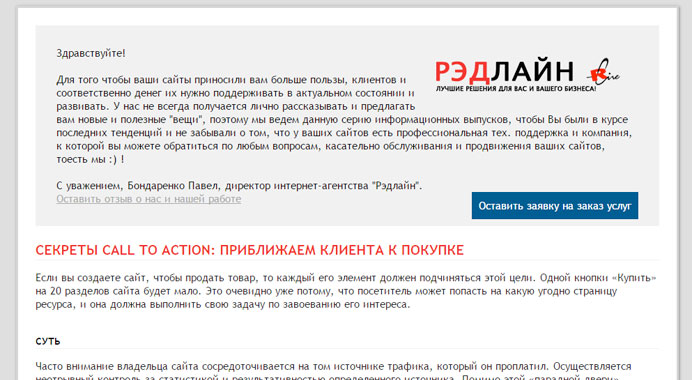 В письмах на e-mail также важно не упустить основную цель компании. Например, еженедельная рассылка Рэдлайн посвящена обучающим материалам. В каждом письме есть кнопка «Оставить заявку на заказ услуг», которая в один клик перенесет вас на целевую страницу. Адресат подписан на самостоятельно, в этом его интерес, значит он, рано или поздно, изъявит желание создать сайт или ему нужны будут услуги по его обслуживанию и продвижению. Удобно и понятно. Работает с заведомо лояльной базой подписчиков.