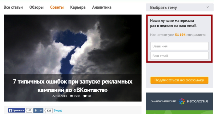 Задача обучающего центра — получить многочисленную аудиторию путем предоставления обучающих материалов, как free, так и платных. На странице каждого бесплатного материала есть форма подписки на рассылку. Форма статична и расположена в первом экране с правой стороны, посетителю не нужно переходить в другой раздел или искать, где подписаться.