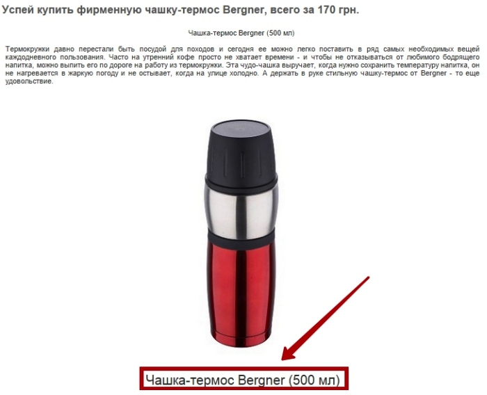 То же самое можно было бы реализовать через кнопку с сопроводительным текстом «Узнать больше» или «Подробная характеристика». Сколько термос держит тепло? Из какого материала он сделан? Что в комплекте? Пока посетитель находится на странице с сообщением, ответов на эти вопросы у него нет. Именно поэтому «Купить чашку-термос Bargner сейчас» — поспешное предложение. При покупке у клиента не должно оставаться вопросов относительно товара.