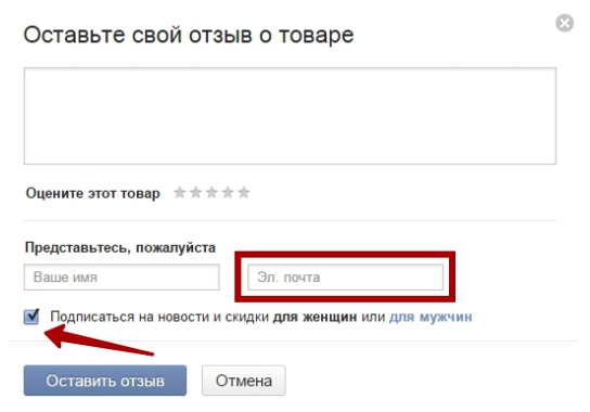 Чтобы оставить отзыв, на сайте lamoda.ru необходимо представиться, оставить адрес электронной почты. Также автор автоматически подписывается на получение почтовой рассылки, но можно отказаться.