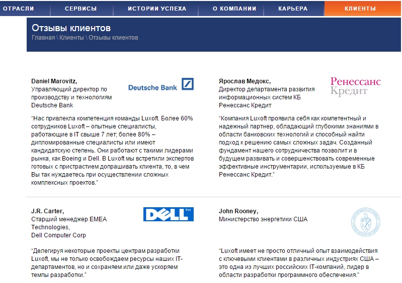 Следите за тем, чтобы отзывы сопровождались реальным именем клиента. С согласия покупателя можно добавить фото, его должность. Фото не обязательно, если информацию в интернете можно найти по имени и должности. Также полезно добавить дату публикации отклика. Пример с сайта luxoft.ru.