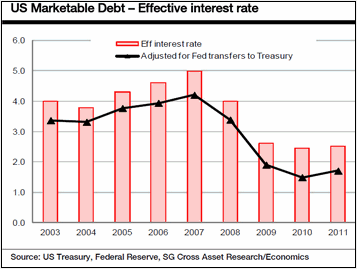 Это также будет означать дальнейший рост объема государственного долга США на балансе ФРС, при этом стоит отметить, что в силу операций TWIST Казначейству США с точки зрения экономической выгоды предпочтительней размещать новые облигации с более длительным сроком обращения, нежели краткосрочные. В Societe Generale обращают внимание на то, что это уже нашло отражение в росте среднего срока до погашения, тогда как реальная эффективная ставка процента для Казначейства снизилась до 1.7% - процентные платежи, которые получает ФРС, раз в год перечисляются в пользу Казначейства.
