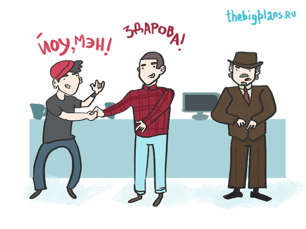 Одного немолодого сотрудника ИТ-компании постоянно шокировали приветствия типа «привет, омлет», «хай» и даже «всем привет», так как, согласно его прежнему опыту, подобные «легкомысленные» игровые приветствия маркировали неуважение к коллегам.