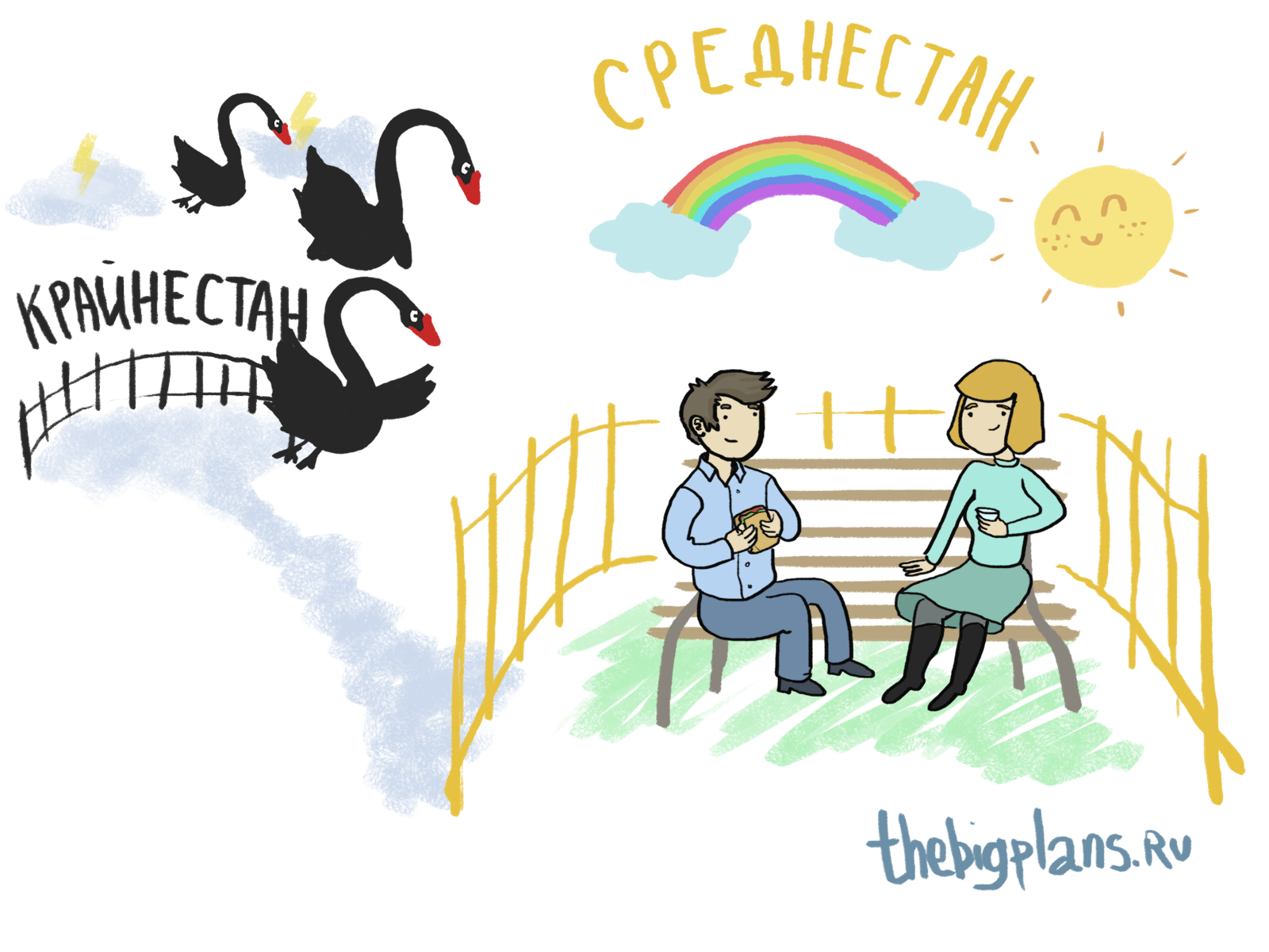 Но середняков это не огорчило, ведь цель оказалась достигнутой: отныне события можно было не просто описывать и классифицировать, их можно было предсказывать. И жизнь бы окончательно наладилась, если бы не периодические, каждый раз внезапные вторжения Черных лебедей — обитателей другой, несправедливой страны, Крайнестана, где балом правит случайность, игра всегда идет по-крупному и, главное, нет середняков, а есть либо победители, либо проигравшие.