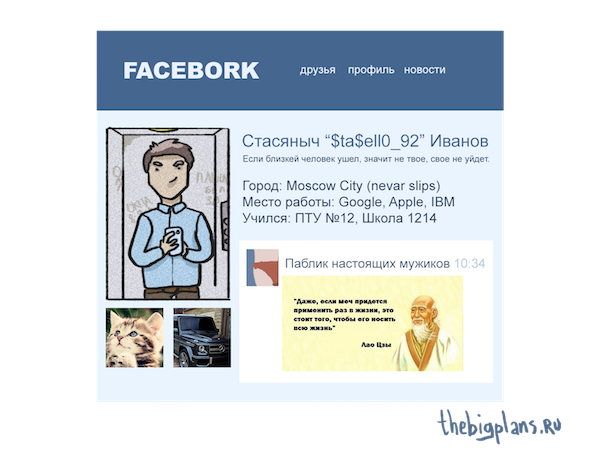 Возможно, вы крутой специалист и отличный парень, но если ваша страница в Фейсбуке рассказывает исключительно о жизни вашего лексуса, байка или четырехглавой мышцы бедра, люди никогда не заметят на ней крутого специалиста и отличного парня, способного изменить мир к лучшему.