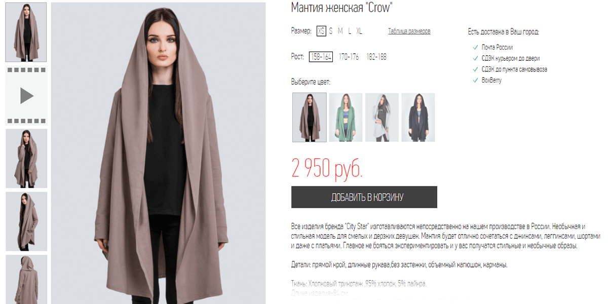 - Карточки товаров. В них должны присутствовать данные о предлагаемом продукте, его описание, характеристики, свойства и т. д. Можно сочетать информацию по сути с эмоциональными вставками для побуждения к отправке продукции в корзину.