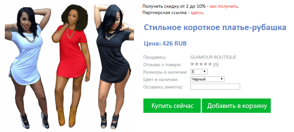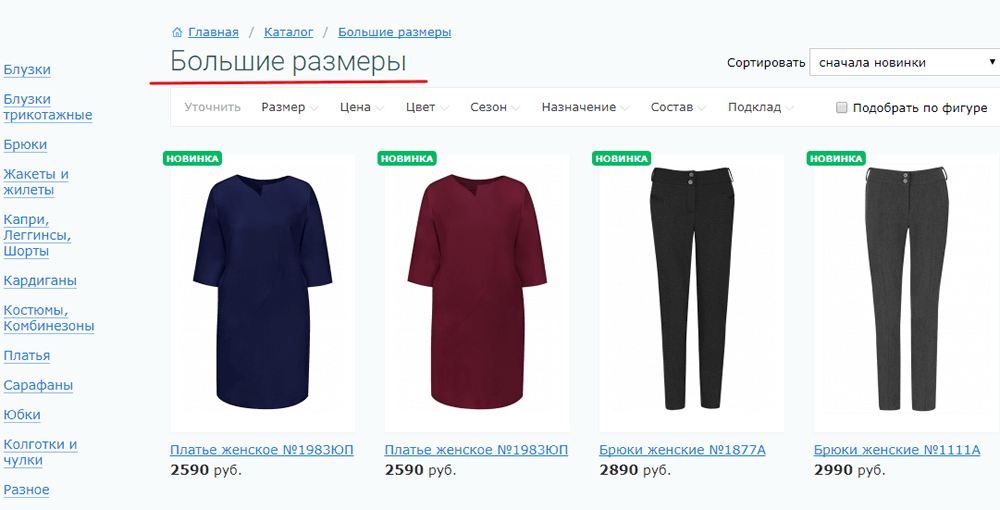 В качестве примера приведём поиск туники большого размера и попадание на такую страницу: