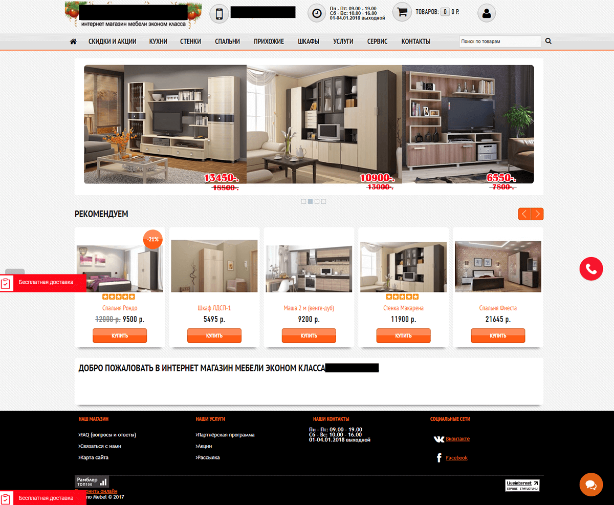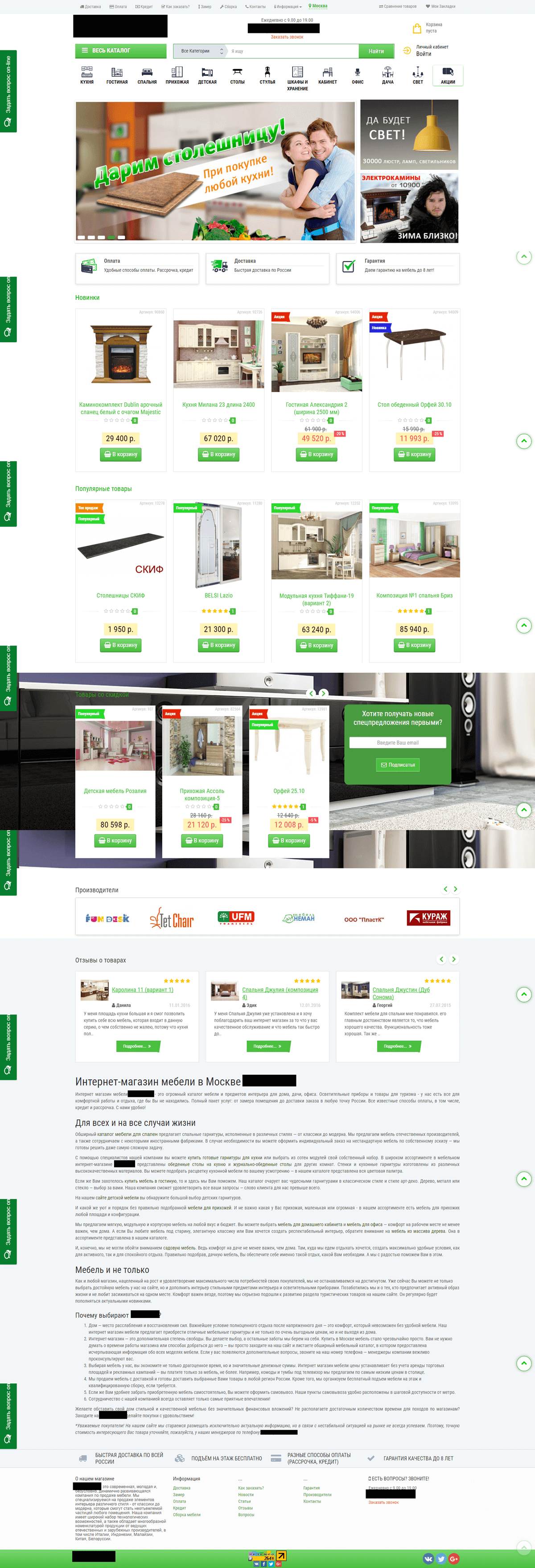 - Главная. Здесь в достаточно сжатой форме нужно рассказать об основных предложениях магазина, его геопривязке, УТП и преимуществах совершения покупок именно тут. Также уместной будет информация об акциях, гарантиях, доставке.