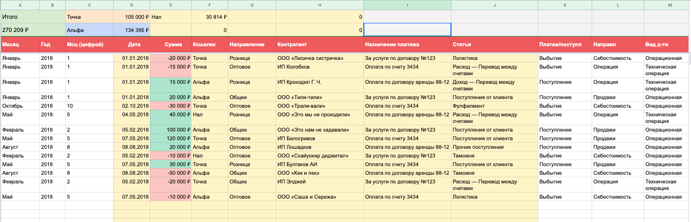Первый отчет – таблица для учета денег на расчетных счетах. Вносите поступления и выбытия, анализируйте денежный поток компании. Скачать шаблон.