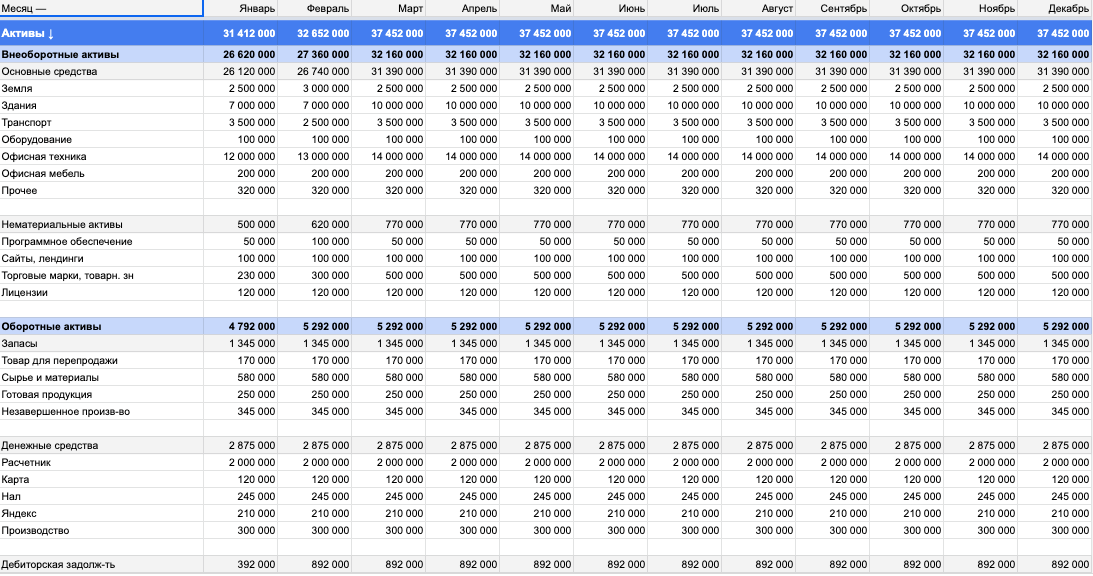 Четвертый отчет – Баланс. Он показывает темп роста собственного капитала компании, состав активов и пассивов. Скачать шаблон.