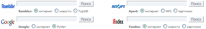 Чем не целесообразна такая поисковая форма? Функции одной поисковой системы дублируются четырежды. Зачем искать в четырёх поисковых системах одновременно, если можно поискать в одной, наиболее мощной? Можно было бы сделать эту систему более полезной, дав возможность поиска отраслевой информации, которую наиболее эффективно позволяет искать только отдельно взятый поисковик. Например, Яндекс ищет по новостям и рунету, Апорт — mp3, Google — по интернету, Rambler — Top100. Кроме того, допускается, что интересы посетителя шире интересов того, кто делал эту систему. Поэтому кроме представленных рубрик посетитель, возможно, пожелает поискать по энциклопедиям, интернет-блогам или по товарам. Не надо пытаться интересы пользователя сузить — не получится. А вот потерять за счёт этого недостатка часть аудитории — легко.
