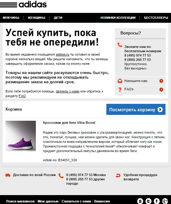 Adidas.ru выбрал тему письма «Упс! Ты кое-что забыл!», где напоминает о брошенной корзине с призывом к действию, продающим описанием и контактами компании.
