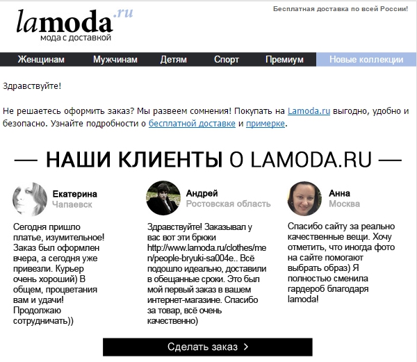Lamoda.ru предлагает развеять сомнения того, кто не оформил покупку до конца. Здесь же бонус на 500 руб. и отзывы звезд. Достаточно длинное письмо-убеждение.