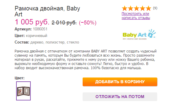 На карточке рядом с товаром обязательно должна быть кнопка «Купить», «Заказать» или «В корзину». Если кнопку сложно найти, то потенциальный клиент может не стать покупателем.