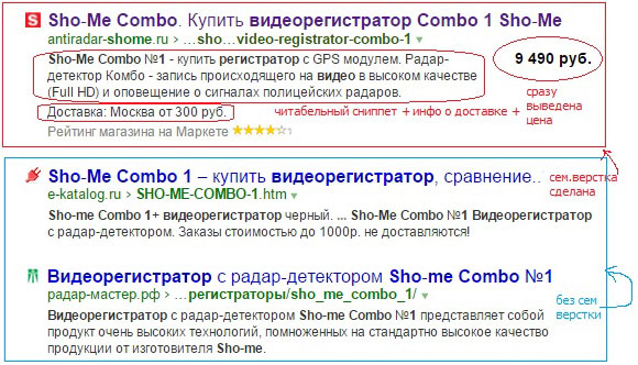 Семантическая верстка карточки товара позволяет показывать товар уже на странице выдачи в поиске. За счет дополнительной информации (цена, наличие товара, доставка и т. п.) ваш сайт станет более привлекательным в результатах поиска, что очень хорошо влияет на кликабельность.