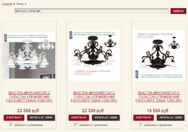 При поиске «люстра с пультом» выдается только 7 люстр, хотя при просмотре люстр с пультом через каталог их более 50, нет сортировки результатов