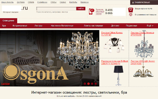Можно просто указать регионы, в которых работаете, если их немного (например: Москва и МО). Чаще всего посетитель вынужден догадываться о географии интернет-магазина по коду города в телефоне. Но иногда код города ни о чем не говорит. Не понять, с какими регионами работает магазин освещения в примере ниже? Нужно идти и читать в раздел «Доставка»...