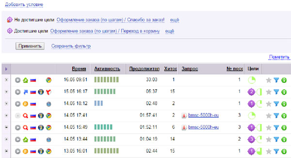 Вебвизор: записи посещений, в которых переходили в корзину, но не совершили заказ
