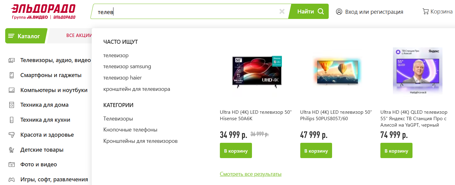 Поисковая строка с автозаполнением — важный инструмент для крупных каталогов. В ней пользователь сможет искать товары по названию, артикулу и категории.