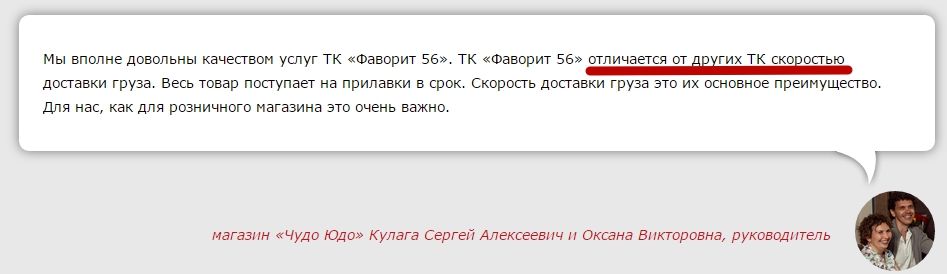 Лучшая похвала компании — та, которая не принадлежит ей самой. Именно поэтому важно собирать и публиковать отзывы ваших довольных клиентов, особенно тех, которые делают упор на вашу уникальность среди конкурентов. Пример с сайта favorit56.ru.