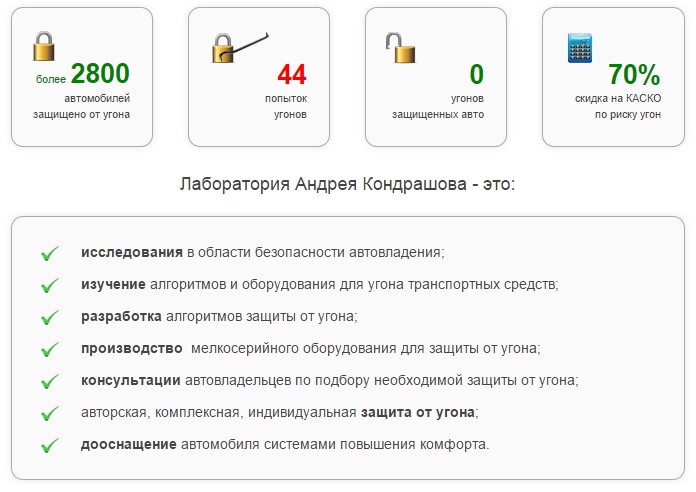 Продукт, связанный с безопасностью, в принципе тяжело позиционировать как-то по-новому. Тем не менее, «Лаборатории Андрея Кондрашева» это удалось. На сайте kondrashov-lab.ru есть утверждение о том, что ни один автомобиль не был угнан, указано количество защищенных машин. Все это сопровождается конкретными преимуществами и бессрочной гарантией. Хороший образец того, как слова подкрепляются фактами. Такому продавцу приятно верить.