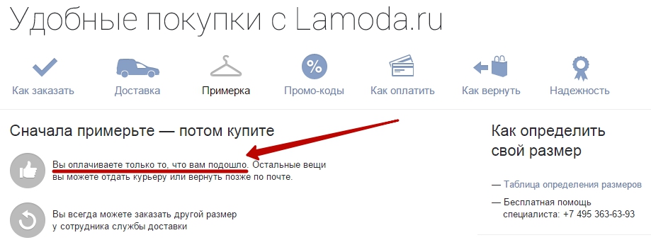 В свое время Lamoda была одним из законодателей принципа «Возврат на доставке». Конечно, здесь есть свои нюансы в виде 15-ти минут на примерку всего, что вы заказали. То есть одинаковое количество времени на заказ из двух или десяти вещей. Тем не менее, это отличает интернет-магазин от конкурентов.
