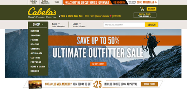 Cabelas.com – а теперь немого углубимся в мужскую тематику и посмотрим вот такой интересный ресурс, где представители сильного пола в прямом смысле слова могут купить все, что душа только пожелает: начиная от одежды, заканчивая деталями для машины и удочками для рыбалки.