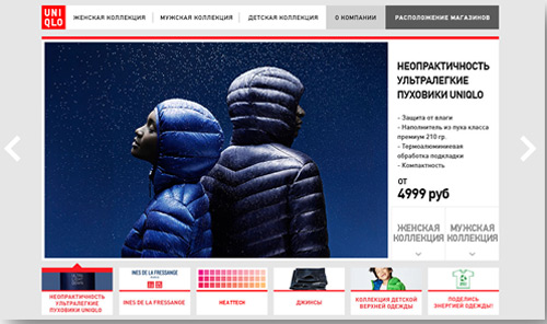 Uniqlo – ресурс, где можно купить качественную и бюджетную одежду одноименного бренда. Фишка в том, что для производства ткани применяются современные технологии. Да и в целом вещи этого бренда – хорошая базовая основа для любого гардероба. Однако повторить такую фишку сложновато для небольшого магазина, но другие, которые Uniqlo использует для саморекламы, – можно.
