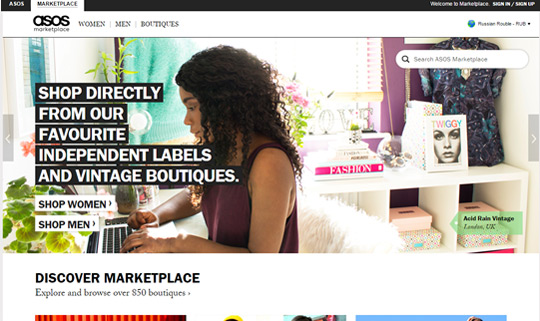 ASOS marketplace – дочерняя площадка известного интернет-магазина asos.com. Идея очень проста и тем прекрасна. Суть в том, что сайт не просто единый магазин, а интернет-торговый центр, где свои товары реализуют разные продавцы, например, молодые, еще неименитые дизайнеры. Для покупателей этот проект интересен тем, что всегда можно отыскать необычную вещь.
