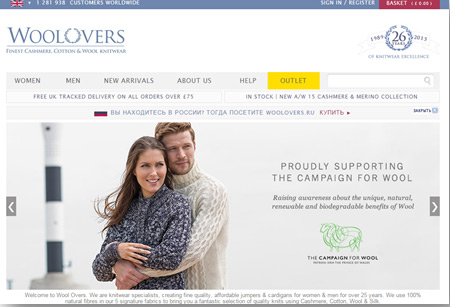 Woolovers.com – особенность этого сайта в том, что здесь можно купить вещи очень высокого качества из британской шерсти, шерсти мериноса и ягненка, а также хлопка и кашемира, кашемира и шелка. По сути их УТП ориентировано на узкосегментированный вид материала, из которого производится одежда. А основной акцент сделан на высоком качестве, и вещи можно даже стирать в машинке!