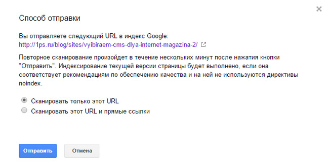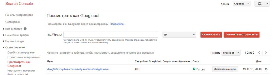 Если у вас есть страница(-ы), которую необходимо проиндексировать как можно быстрее, есть смысл добавить ее в панель вебмастеров Google. Раздел Сканирование → Посмотреть как Googlebot. Указываете ссылку на страницу, нажимаете кнопку «Сканировать». После сканирования появляется кнопка «Добавить в индекс».