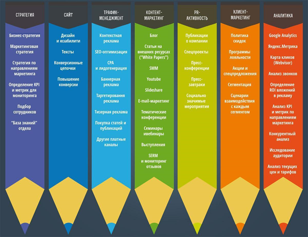 - Комплексность и системность. Именно они сейчас в тренде. На практике это значит, что для привлечения и удержания клиентов используется широкий набор инструментов. Среди них и правила, действующие для обычного (оффлайн) маркетинга, и SEO, и интересный контент (тексты, изображения и т. д.), и рассылки Email, и SMM. Комплексное использование возможностей позволит выстроить схему отношений с клиентами на разных этапах сотрудничества и при этом сделать её цельной, основанной на логике и аналитике.