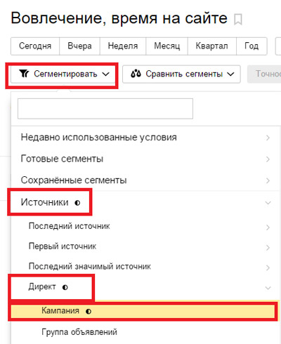 Теперь жмем «Сегментировать» → «Источники» → «Директ» → «Кампания». Выбираем нужную кампанию: