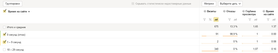 Из статистики видно, что 91 визит из 675 продлились 0 секунд, а 2 из 675 были от 1 до 9 секунд. Эти показатели не так велики (13% «нулевых» визитов), поэтому нет нужды принимать экстренные меры. Но если количество «нулевых» визитов превышает 25%, то следует уже подстраховаться.