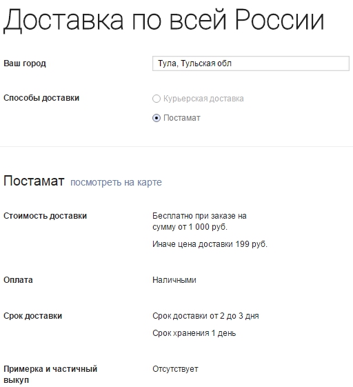 Lamoda.ru позволяет ввести на своем сайте город, в который будет осуществляться доставка. При такой географии присутствия, как у этого интернет-магазина, подход оправдан. Результат выдачи — подробные условия: