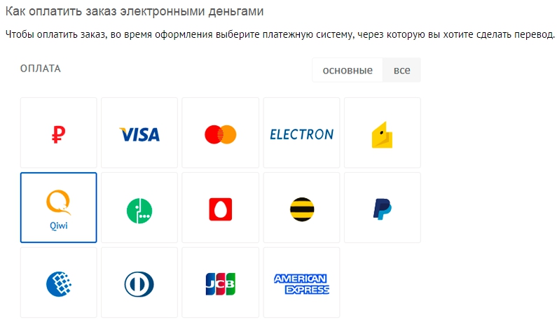 Способы оплаты. Нужно указать все имеющиеся, а электронные платежные системы и банки — с логотипами. Если у вас всего 2-3 способа, целесообразно объединить информацию с условиями доставки. Если больше — выделить в отдельный раздел.