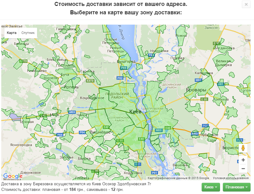 Карта доставки. Супермаркет Novus на своем сайте разделил карту Киева на зоны. При наведении на какую-либо показывается индивидуальная стоимость доставки. В виде списка это была бы бесконечная страница. Так можно сделать и с картой страны.