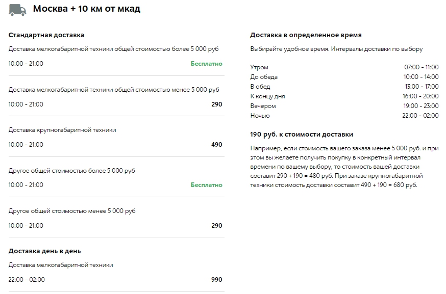 Цена. Не скрывайте от клиента стоимость доставки. Некоторые интернет-магазины пишут «Стоимость доставки уточняйте у менеджера». То есть клиент еще как следует не мотивирован на покупку, а уже должен что-то выполнять. Это может отпугнуть. Например, «М.видео» на своем сайте честно и подробно расписал стоимость доставки по городу и в область; особые условия: