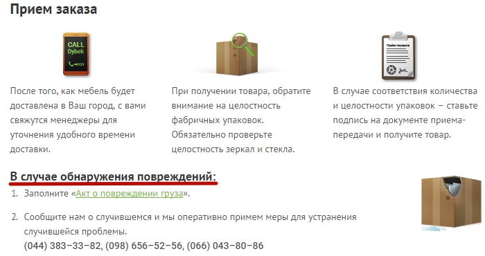 Гарантия. Утверждайте, что доставка будет бережной, а если товар будет поврежден, клиент имеет право на замену, возврат своих денег или отказ от оплаты. Интернет-магазин мебели Dubok.ua предлагает заполнить «Акт о повреждении груза»