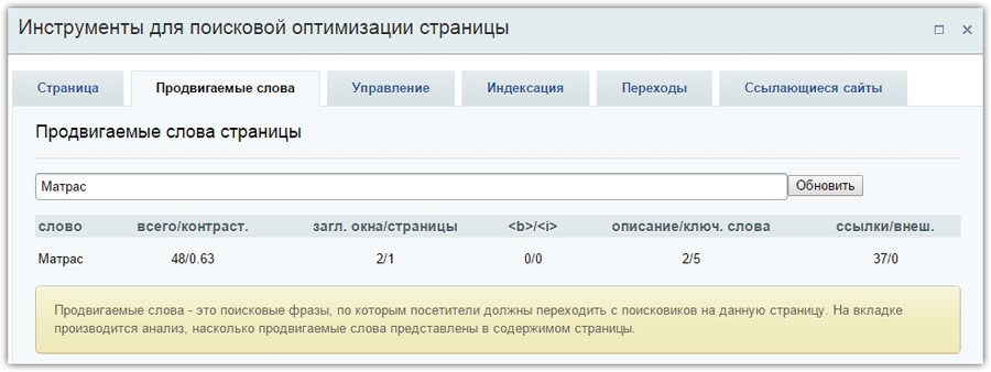 Вкладка позволяет увидеть всю информацию по конкретному продвигаемому слову или фразе на данной странице.
