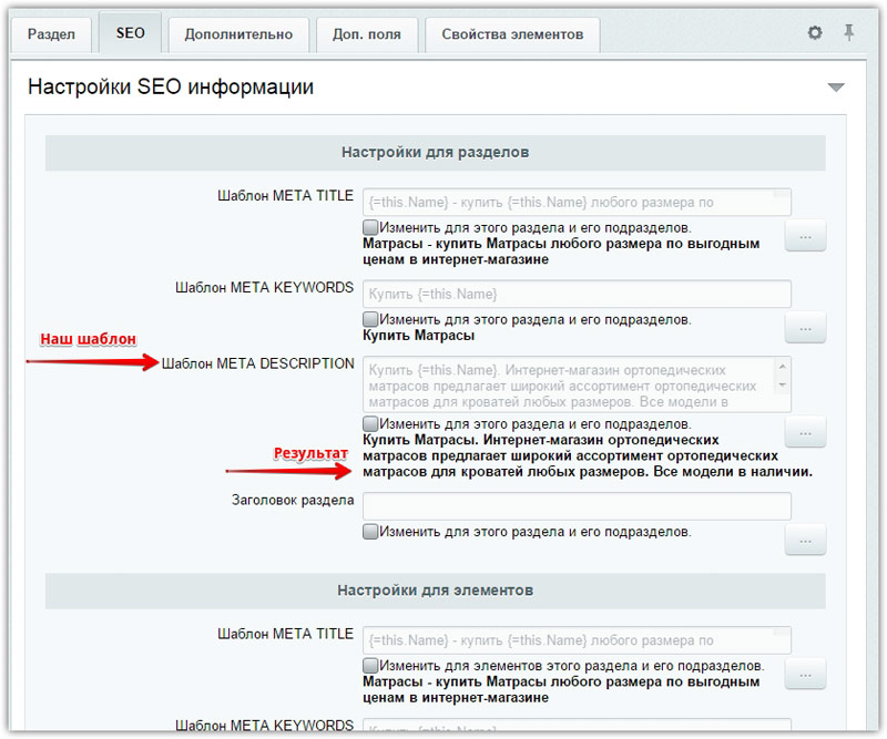 Для динамических страниц каталога и товаров на сайте мы имеем возможность настраивать шаблоны генерируемых заголовков, описания и ключевых слов.
